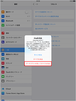 「 iPad を消去」にてeSIMのデータを継続利用する場合は、「データプランを残してすべてを消去」を押す
