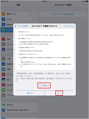 「4Gデータプリペイドのご利用にあたって(重要事項説明)」を確認後、内容に同意される場合は、「同意する」にチェックし、「次へ」を押す