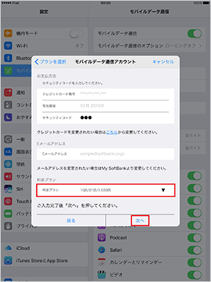 クレジットカード情報を入力し、料金プランを選択後、「次へ」を押す