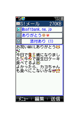 300Kバイトを超えるメール容量で添付ファイルを送受信できます(最大2Mバイト)。高画質カメラで撮影した写真を添付したり、パソコンから送付された大容量の添付ファイルも受信することが可能です。