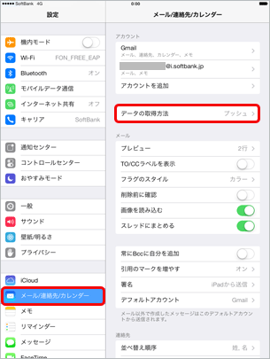画面左の「メール/連絡先/カレンダー」を押し、画面右の「データ取得方法」を押します。