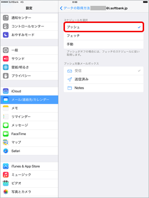 「プッシュ」を「オン」にし、メール(@i.softbank.jp)のアカウントを押します。
