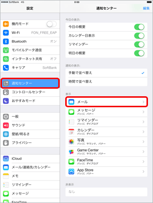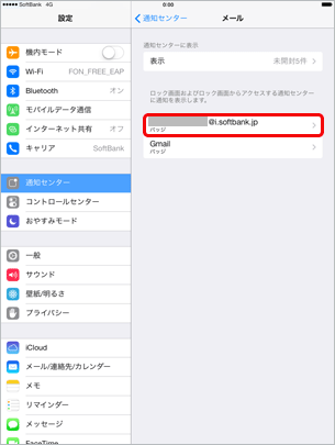 画面左の「通知センター」を押し、画面右の「メール」を押します。