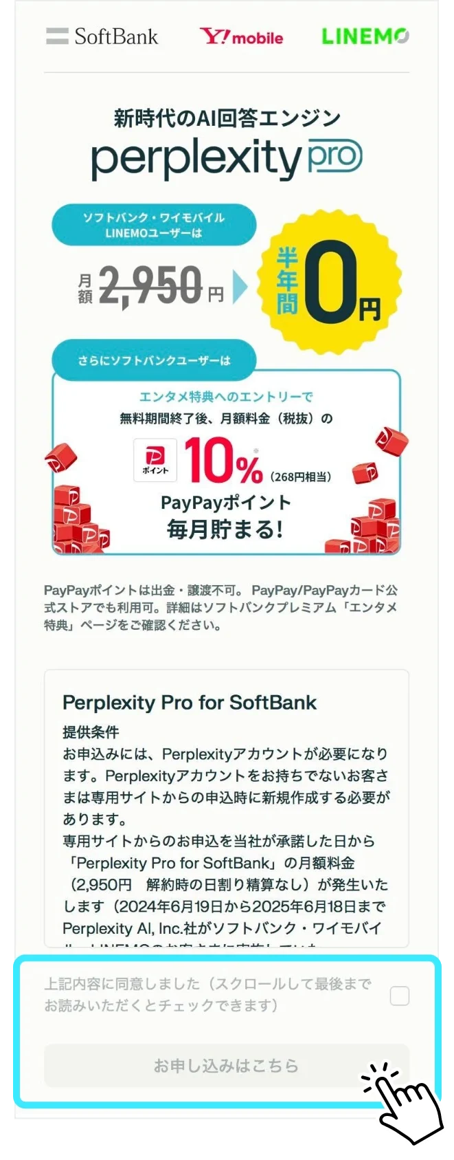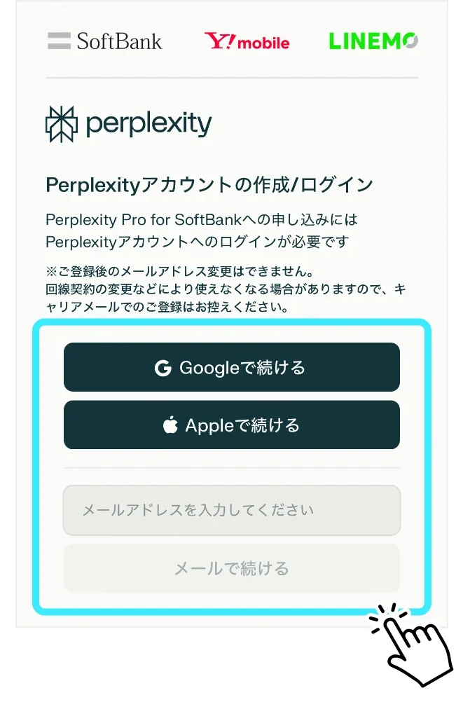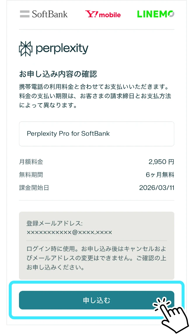 - お申込みに当たっては、Perplexity Pro for SoftBank提供条件書、Perplexity利用規約、Perplexity プライバシーポリシーへの同意が必要です。