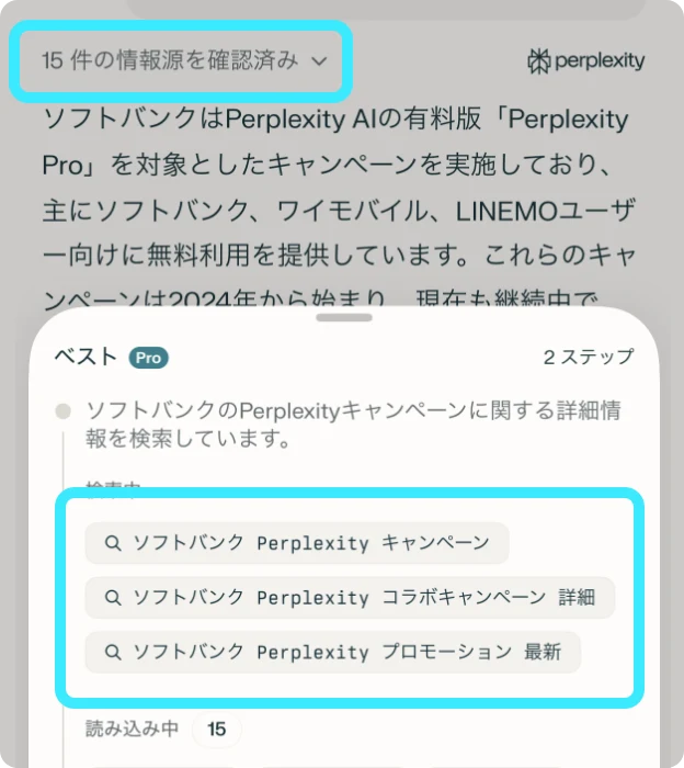 - Perplexity ProはPerplexity AI, Inc.が提供するサービスでありソフトバンク株式会社のサービスではありません。 Perplexity Proのサービス詳細は、Perplexity AI, Inc.のサービスサイトなどでご確認ください。 ソフトバンク株式会社はサービス内容などに関する保証はいたしかねます。