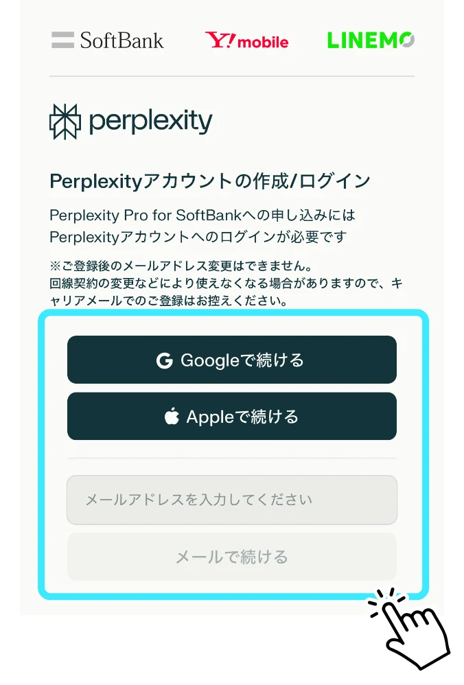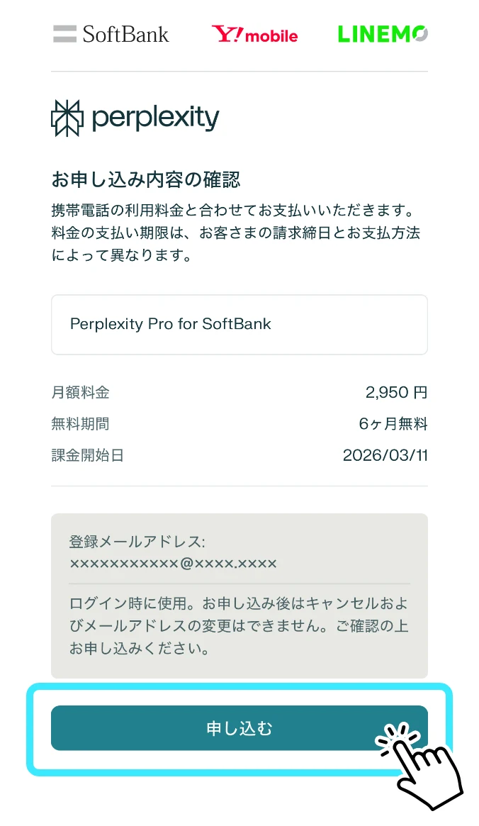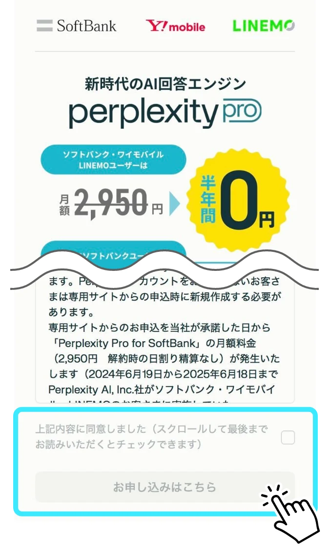 - お申込みに当たっては、Perplexity Pro for SoftBank提供条件書、Perplexity利用規約、Perplexity プライバシーポリシーへの同意が必要です。
