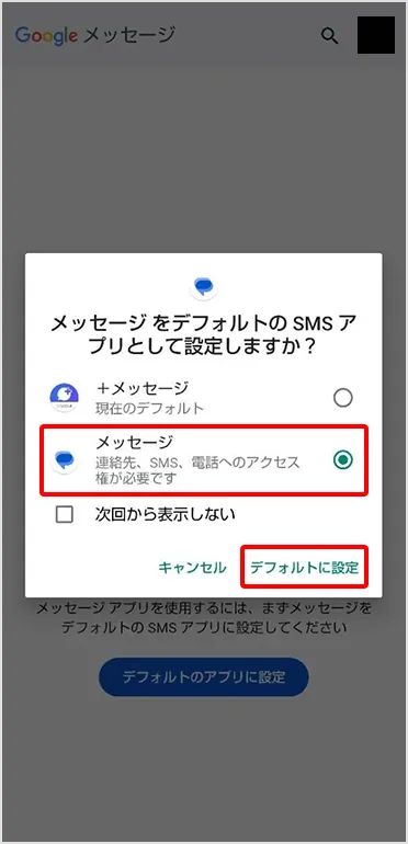 「メッセージ(Google メッセージ)」を選択し、「デフォルトに設定」をタップ
