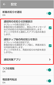 | 通知時のお知らせ詳細表示の変更 | 新着お知らせ通知時に「差出人やメッセージなどのお知らせ内容の詳細を表示する」または「通知したアプリ名のみ表示する」のいずれかを選択できます。 |