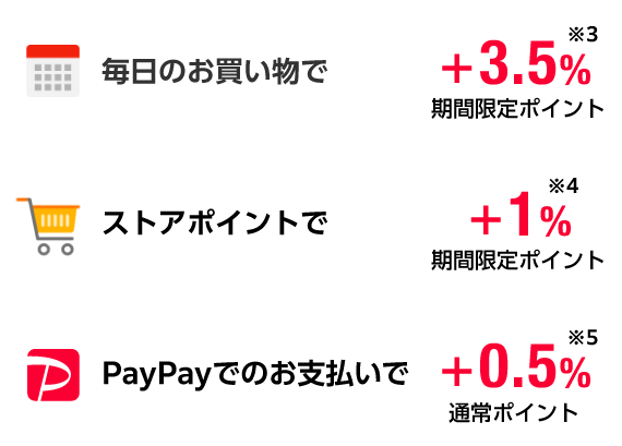 - ※5PayPay(残高/ポイント)での決済額に対し0.5%、PayPayクレジットでの決済額に対し1%を付与。PayPayカード(旧Yahoo! JAPANカード含む)、PayPayカード ゴールドでの決済時は「PayPayカード特典」として決済額に対し1%を付与。