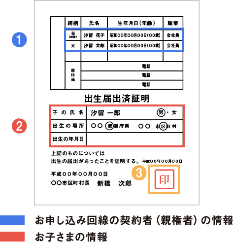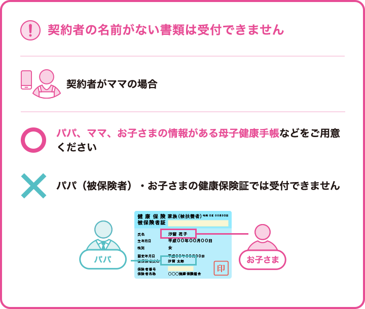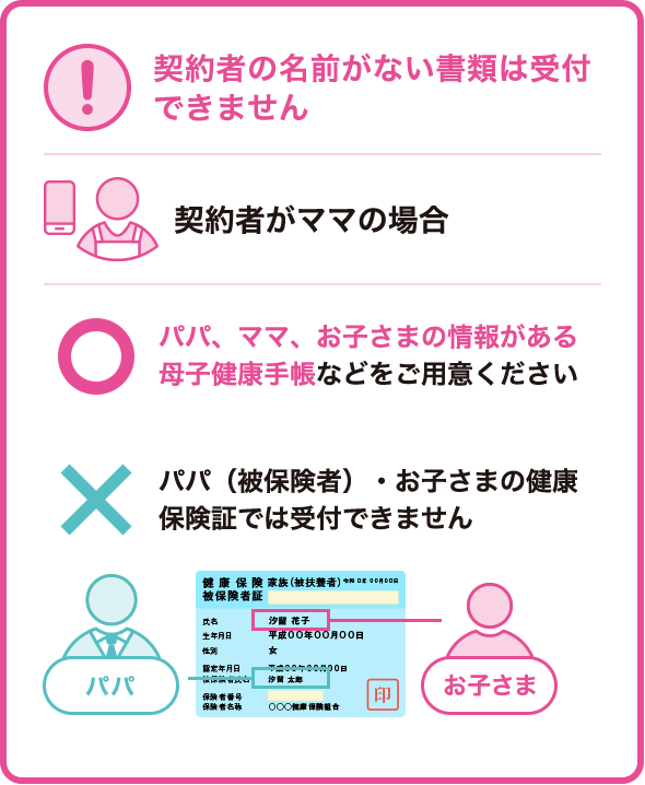• 契約者とお子さまの名前がある家族関係書類などをご準備ください。