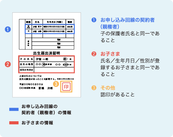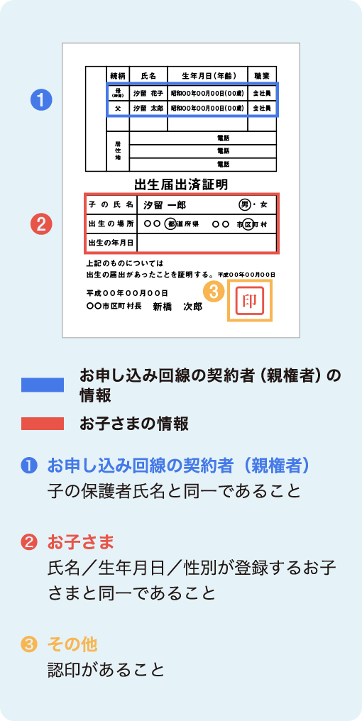 ①お申し込み回線の契約者(親権者)子の保護者氏名と同一であること②お子さま氏名/生年月日/性別が登録するお子さまと同一であること③その他認印があること ①お申し込み回線の契約者(親権者)子の保護者氏名と同一であること②お子さま氏名/生年月日/性別が登録するお子さまと同一であること③その他認印があること