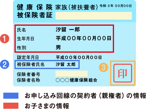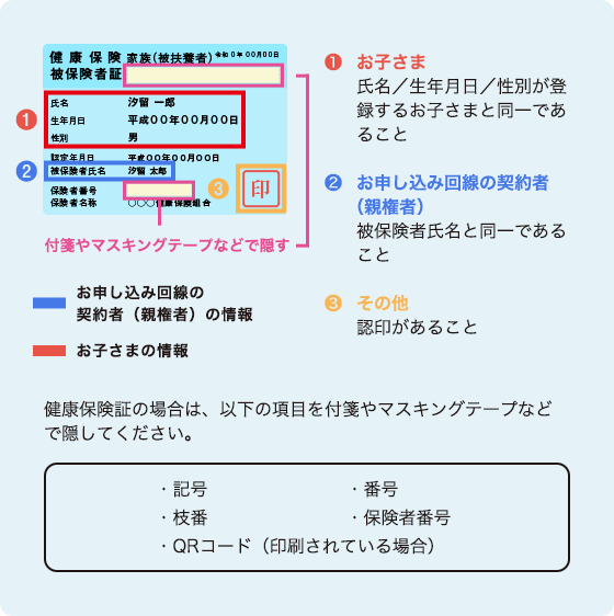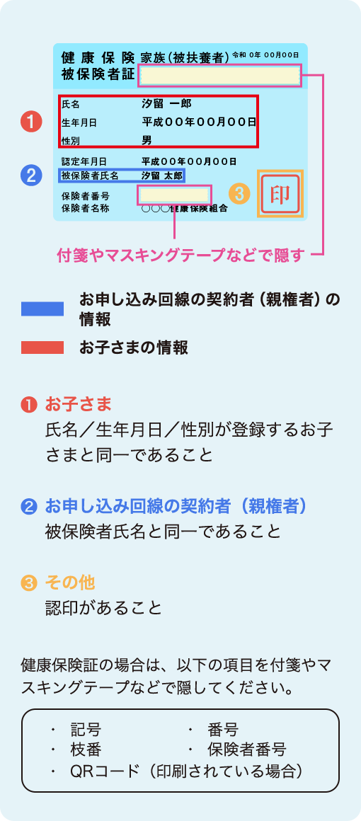 ①お子さま 氏名/生年月日/性別が登録するお子さまと同一であること& #9313;お申し込み回線の契約者(親権者) 被保険者氏名と同一であること ③その他 認印があること ④有効期限 有効期限内であること 資格確認書の場合は、以下の項目を付箋やマスキングテープなどで隠してください。・記号 ・番号 ・枝番 ・保険者番号 ・QRコード(印刷されている場合) ①お子さま 氏名/生年月日/性別が登録するお子さまと同一であること& #9313;お申し込み回線の契約者(親権者) 被保険者氏名と同一であること ③その他 認印があること ④有効期限 有効期限内であること 資格確認書の場合は、以下の項目を付箋やマスキングテープなどで隠してください。・記号 ・番号 ・枝番 ・保険者番号 ・QRコード(印刷されている場合)