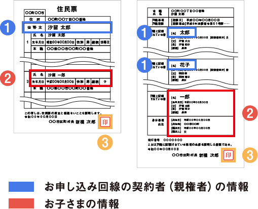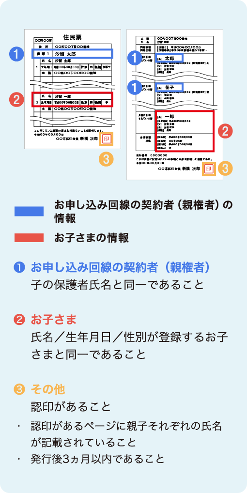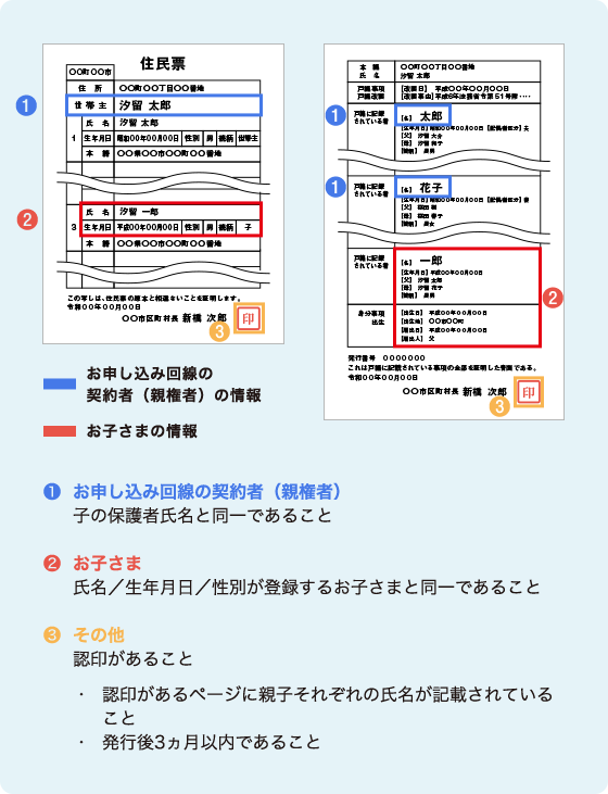 ①お申し込み回線の契約者(親権者)子の保護者氏名と同一であること②お子さま氏名/生年月日/性別が登録するお子さまと同一であること③その他認印があること・認印があるページに親子それぞれの氏名が記載されていること・発行後3ヵ月以内であること ①お申し込み回線の契約者(親権者)子の保護者氏名と同一であること②お子さま氏名/生年月日/性別が登録するお子さまと同一であること③その他認印があること・認印があるページに親子それぞれの氏名が記載されていること・発行後3ヵ月以内であること