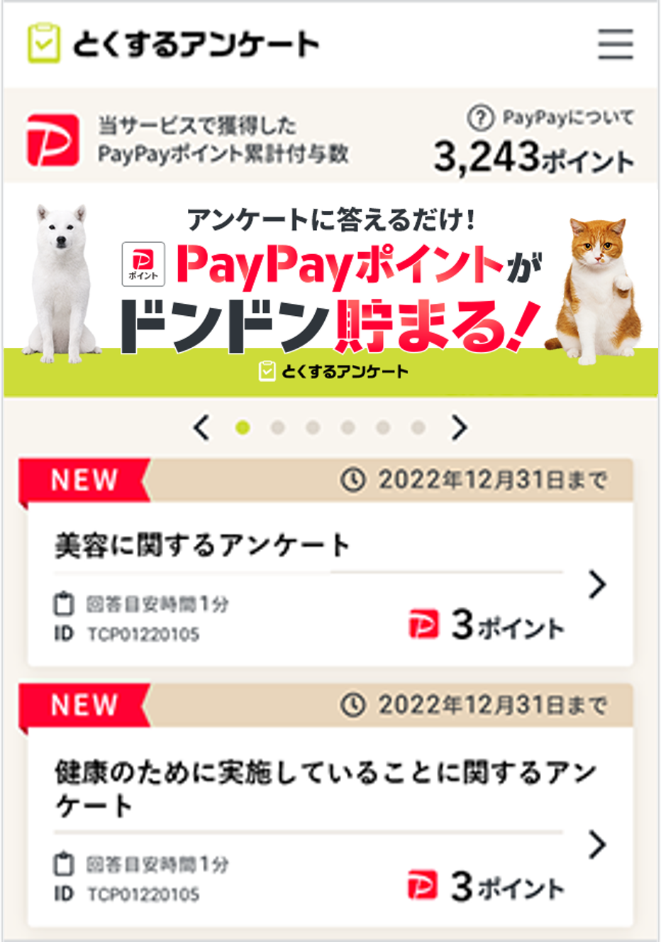 好きなタイミングで好きなアンケートに答えるだけで、PayPayポイントがもらえるサービスです。