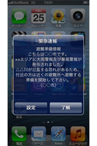 緊急速報メールを受信するとポップアップでメッセージが表示されます。過去の受信メッセージは、「緊急速報メール」アプリでご確認頂けます。