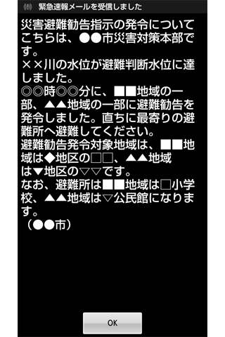 「災害・避難情報」を受信した場合、災害・避難情報の専用着信音、バイブレーション、画面表示でお知らせします。