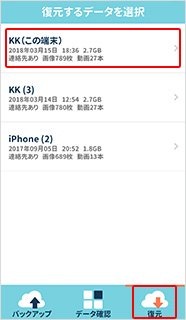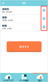 「連絡先」「画像」「動画」をチェックし「復元する」ボタンを押す