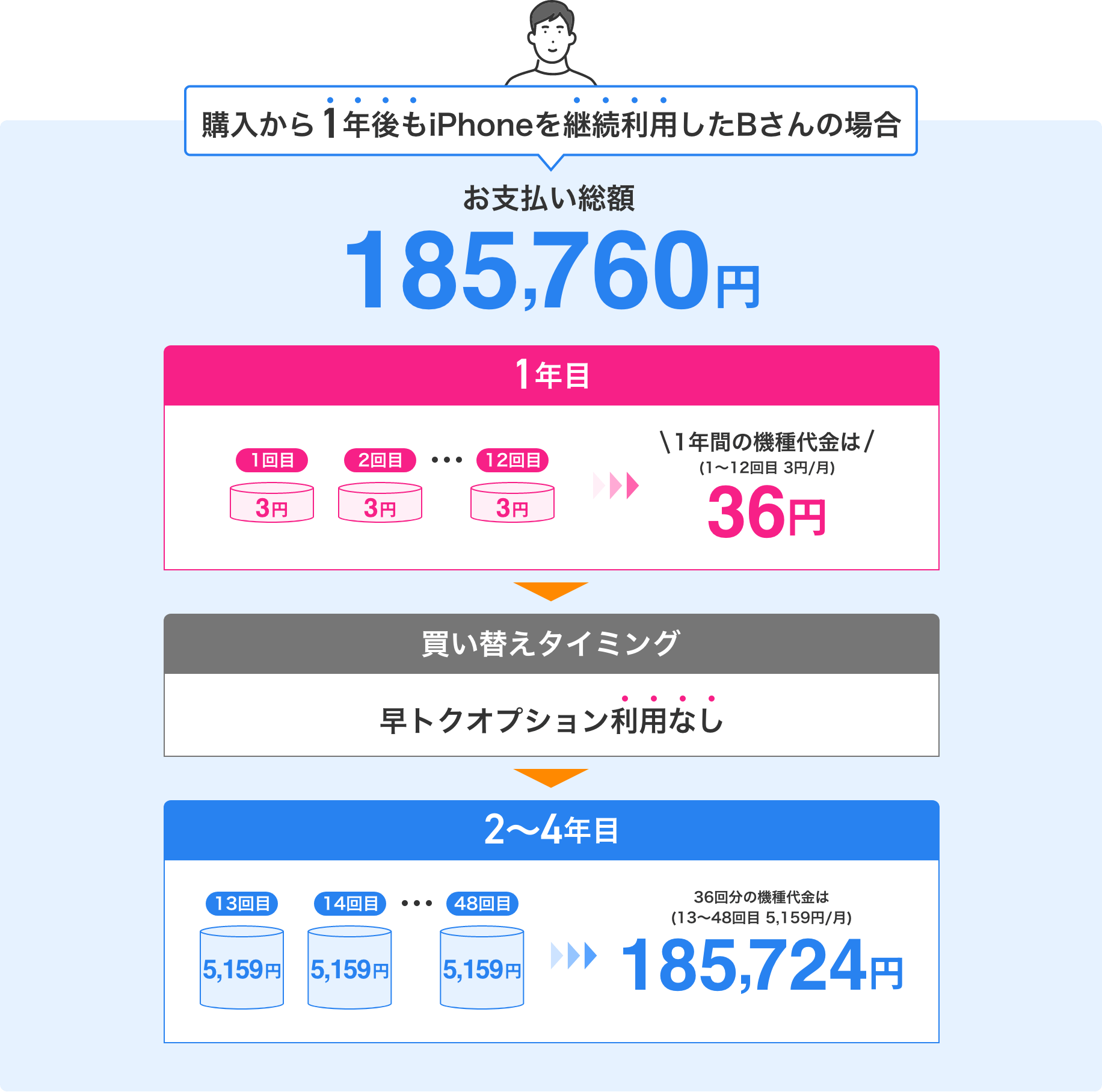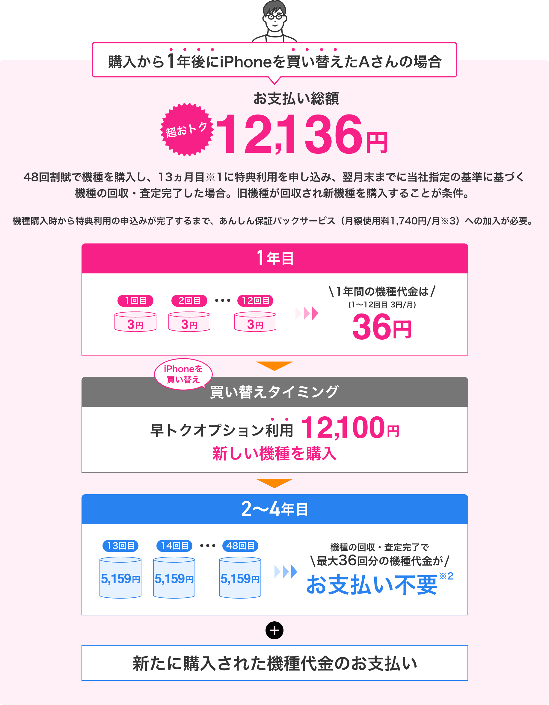 ご購入の機種・時期によって、1~12回目と13~48回目の分割支払金(賦払金)の金額が異なる場合があります。