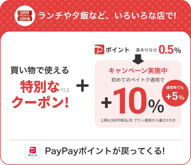 - 「PayPayクレジット」「PayPay残高」「PayPayポイント」以外のPayPayカード、PayPayカードゴールド、PayPay残高カードなどでのお支払いは対象外。