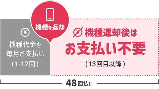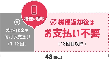 端末価格を48回払いでご契約いただき、25ヵ月目に本体をご返却いただくことで、