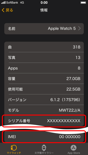 バンドの溝にIMEI(数字15桁)が記載されています。