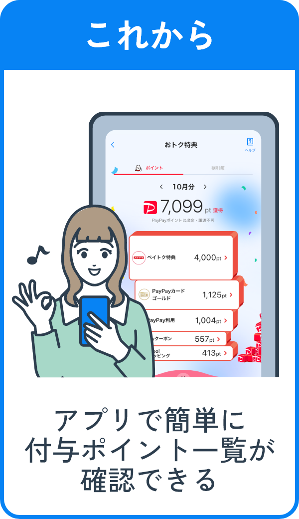 アプリ起動後、右上のアイコンをタップすると、おトク特典画面に遷移し、先月一ヶ月で付与されたポイントが確認できます。