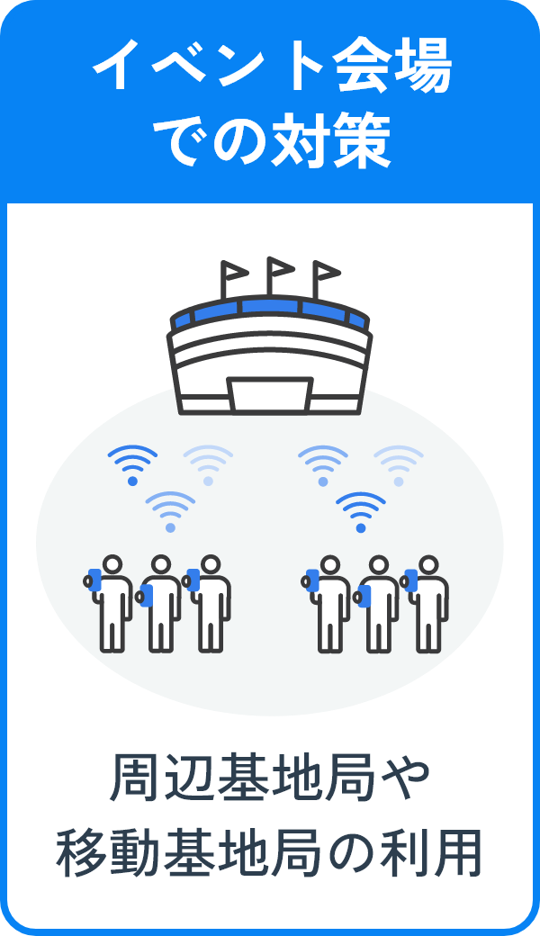 多くの人が集まるイベントでは、通信品質低下が起こらないよう予め対策を行っています。
