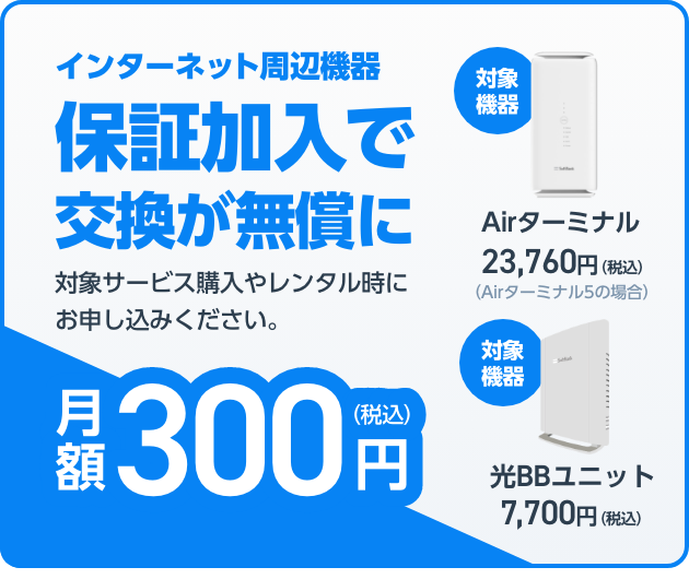 保証対象機器であれば、接続機器などが故障、破損などした場合やレンタル機器の盗難および紛失した場合に発生する「修理交換料金」「違約金」を免除する保証サービスです。