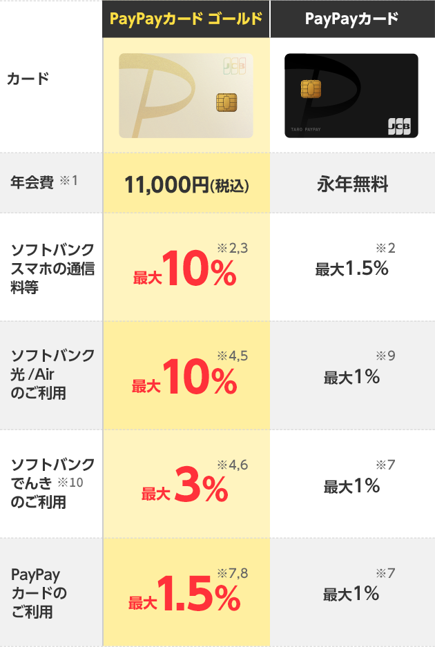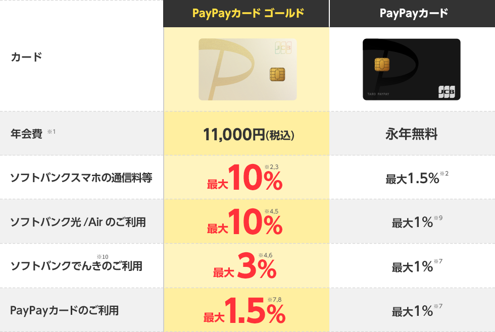 PayPayカード ゴールドは年会費11,000円(税込)となります。初年度は契約月の翌々月、次年度以降は契約月の翌月のご請求となります。請求時に再発行等の理由でカードのご利用が一時停止していた場合、請求月が変更される場合があります。