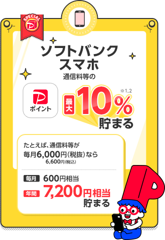スマホ・光/Airのご利用料金1,000円(税抜)ごとに各付与率を乗算したポイントを付与。PayPayカードのアカウント連携要。PayPayポイントで受け取るには自動交換設定が必要です。