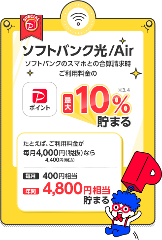 SoftBank 光/Airのみをご利用のお客さまは1%となり、PayPayポイントでの付与となります。PayPayポイントはご利用料金200円(税込)ごとに付与。