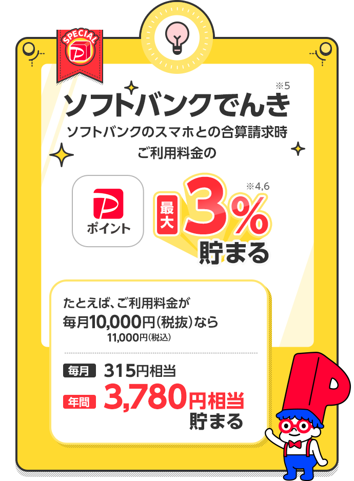 ソフトバンクでんきのみをご利用のお客さまは1%となり、PayPayポイントでの付与となります。PayPayポイントはご利用料金200円(税込)ごとに付与。