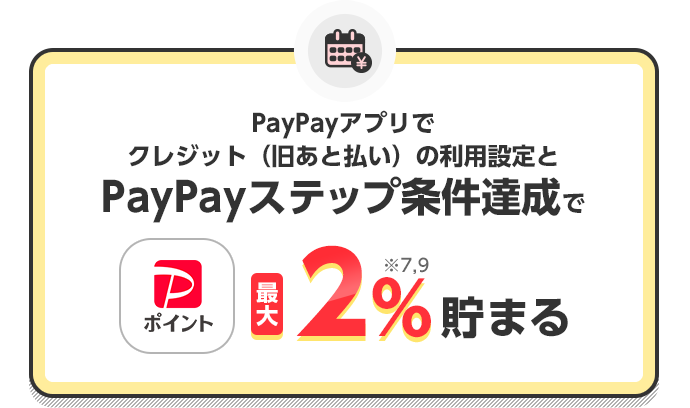 「PayPay(クレジット)」の利用設定が未完了の場合はPayPayステップの対象外。最大の付与率にはPayPayステップの条件達成(200円以上の決済30回以上かつ決済金額合計10万円以上)が必要。付与率は前月のご利用状況により異なります。また一部対象外の決済あり。付与内訳等の詳細はこちら