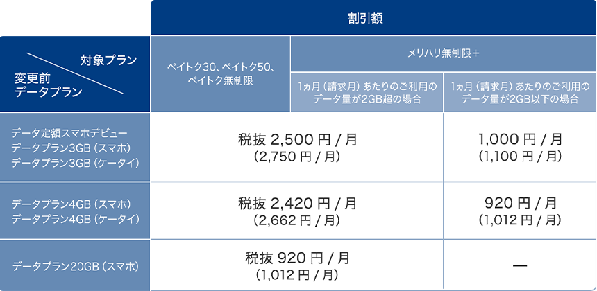 - 割引は適用条件に合致した当該請求月から適用となります。割引対象データプランが日割り計算となる場合、本割引額も日割り計算を行います。