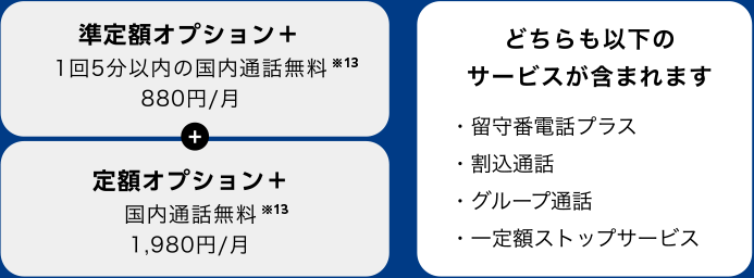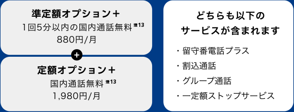 - 定額料をお支払いいただくことで、通話料などの割引、並びに「留守番電話プラス」「一定額ストップサービス」「割込通話」および「グループ通話」をご利用いただけるオプションサービスです。