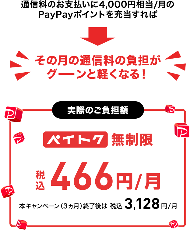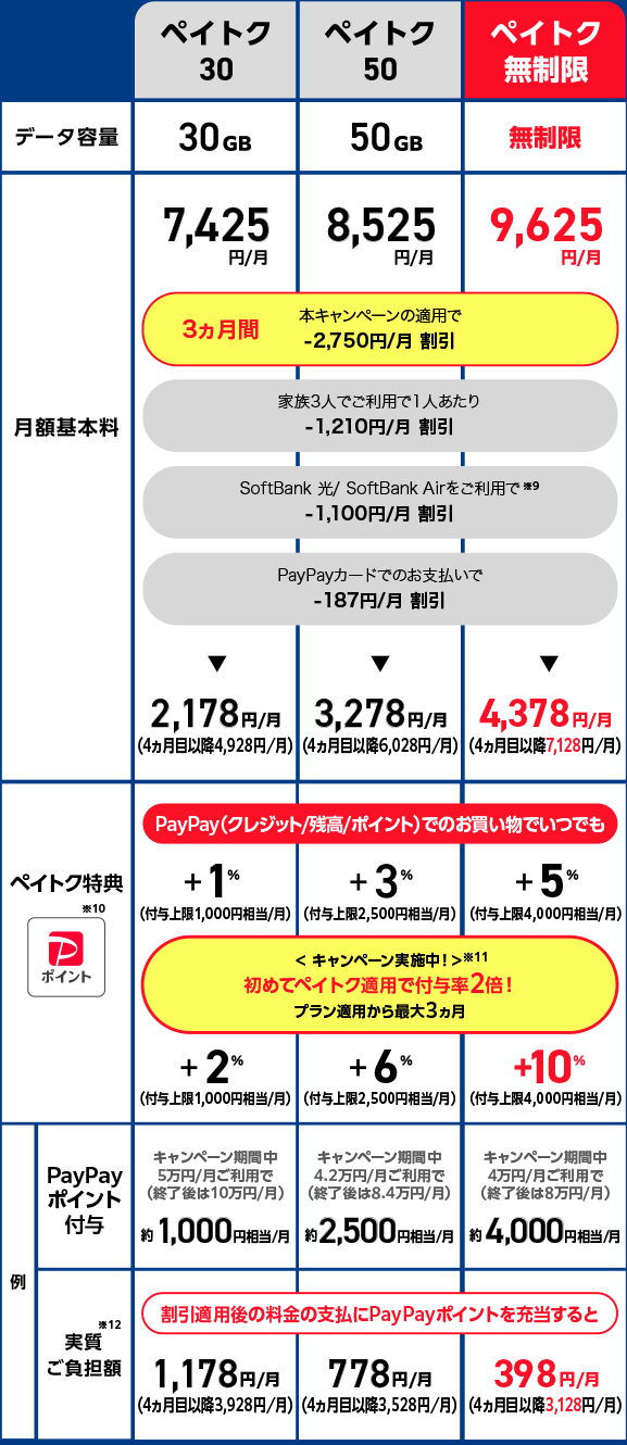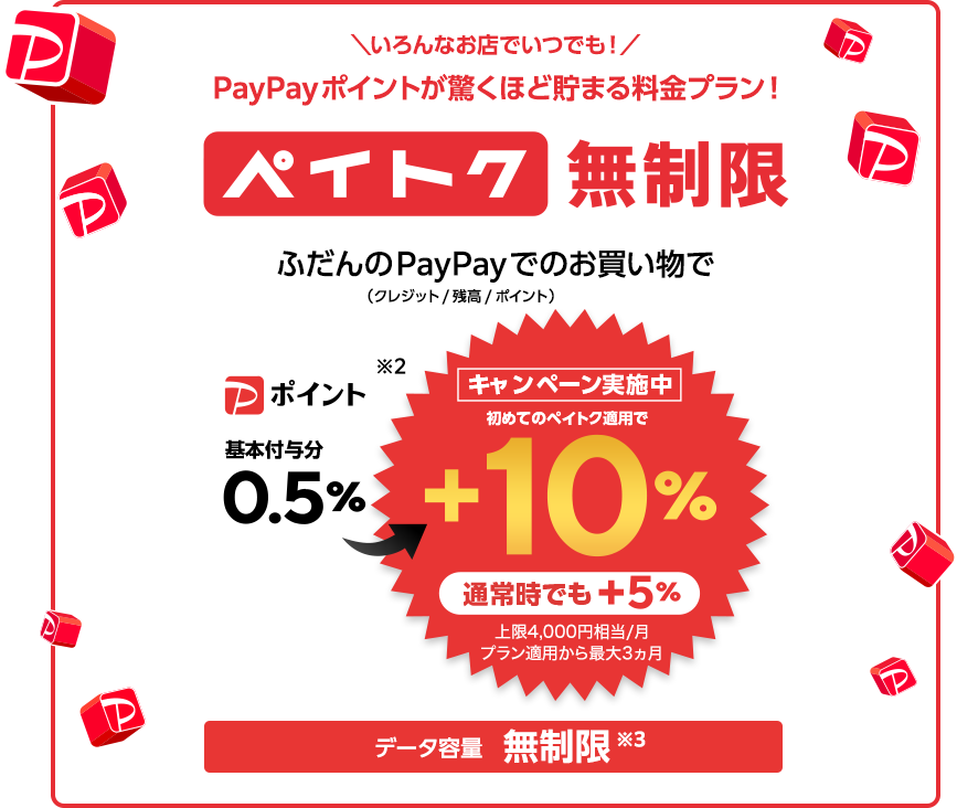 - 「データプランペイトク無制限」「データプランペイトク50」「データプランペイトク30」(以下、「対象データプラン」といいます)の「ペイトク特典」の付与率を、対象データプランの適用日の属する請求月を含む最大3請求月の間、通常の付与率の2倍とするキャンペーンです。
