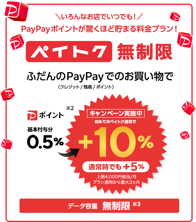 - データプランを変更する場合、システム上の都合によりデータプラン変更適用日の午前0時以前に変更後のデータプランの特典付与率および付与上限に切り替わり適用される場合があります。 この場合、変更前のデータプランの特典の付与上限が残っていたとしても、当該特典の付与率および付与上限は適用されません。適用される特典については、PayPayアプリにてご確認ください。