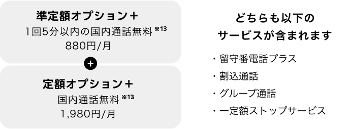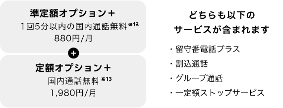 - 定額料をお支払いいただくことで、通話料などの割引、並びに「留守番電話プラス」「一定額ストップサービス」「割込通話」および「グループ通話」をご利用いただけるオプションサービスです。