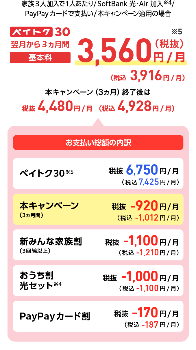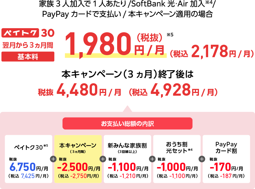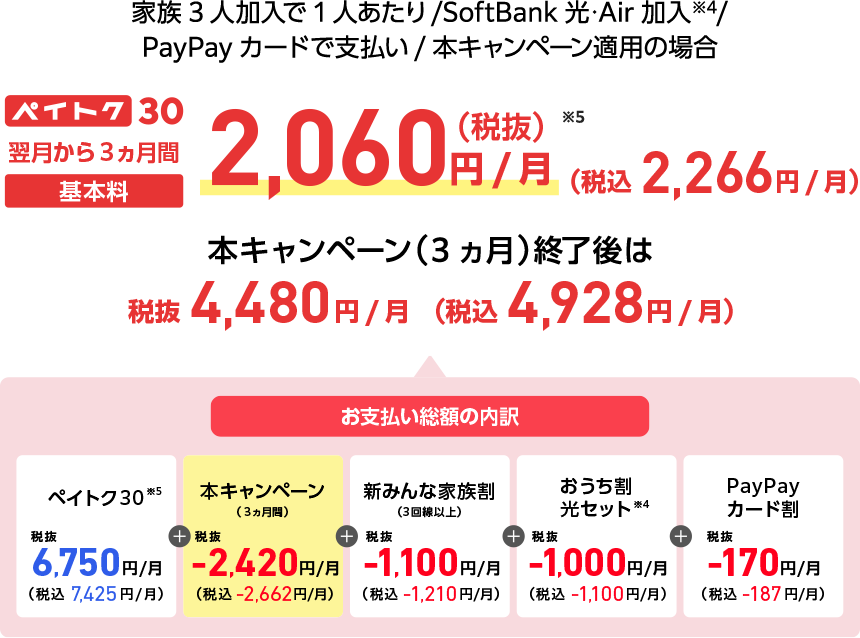- ソフトバンクをすでにご利用中のお客さまが申し込む場合は、翌請求月から適用されます(一部異なる場合があります。詳細は提供条件書をご確認ください)。
