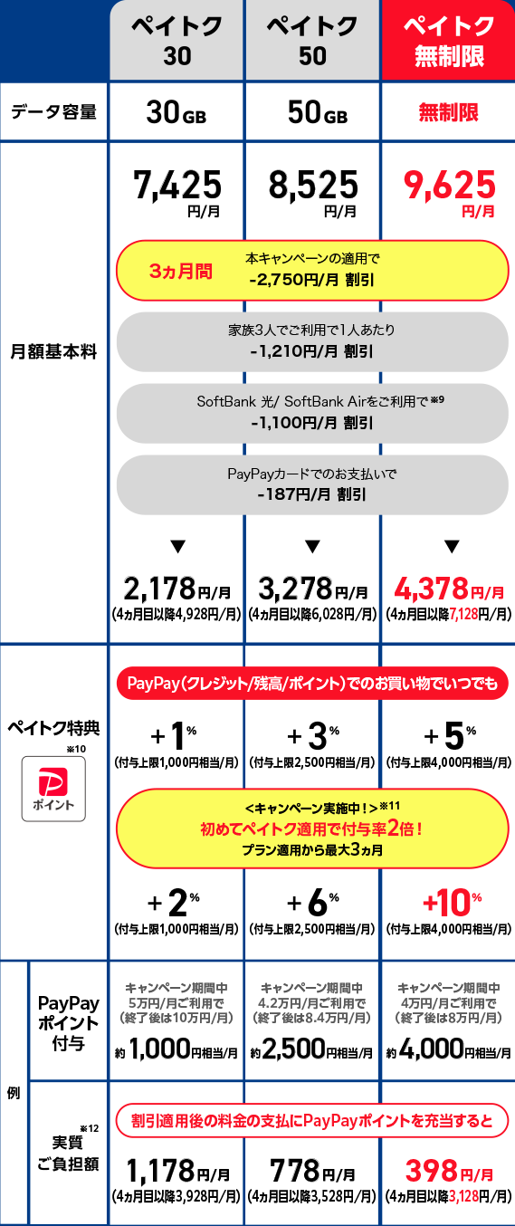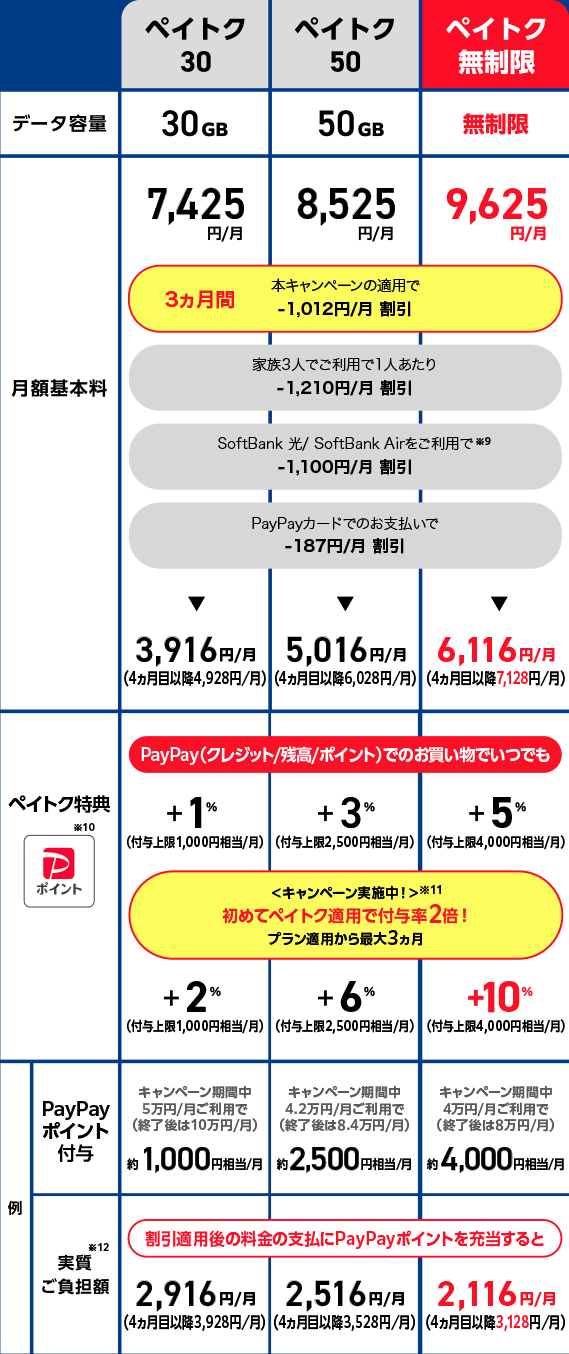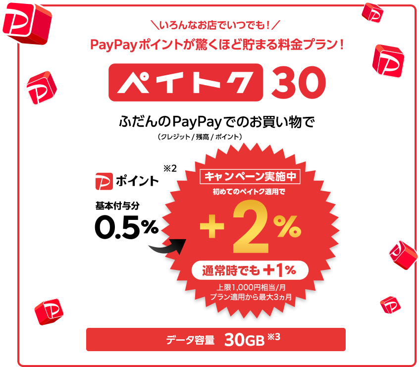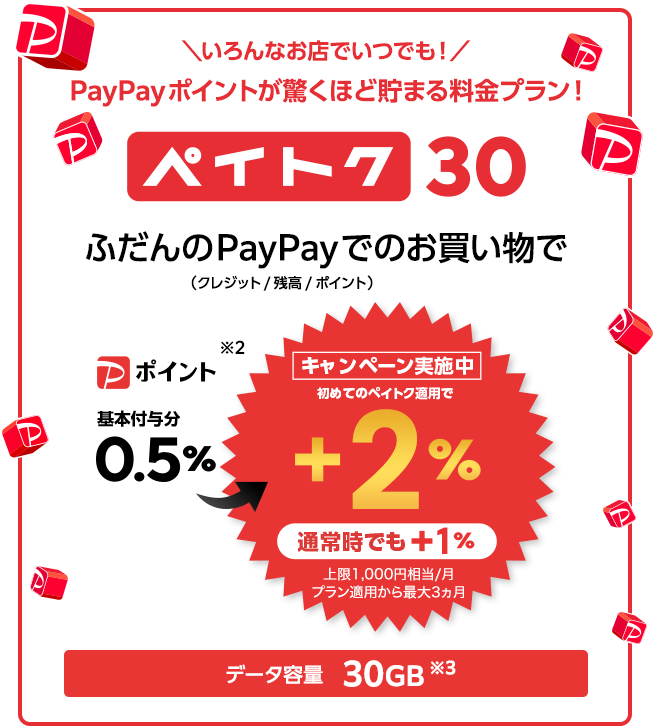- 「データプランペイトク無制限」「データプランペイトク50」「データプランペイトク30」(以下、「対象データプラン」といいます)の「ペイトク特典」の付与率を、対象データプランの適用日の属する請求月を含む最大3請求月の間、通常の付与率の2倍とするキャンペーンです。