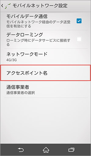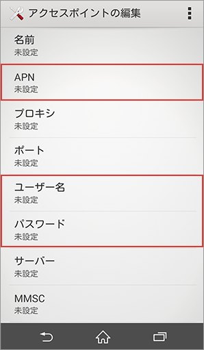 「アクセスポイント名」→ アクションバーの「+」をタップし記載されている「APN」、「ユーザー名」、「パスワード」を設定します。