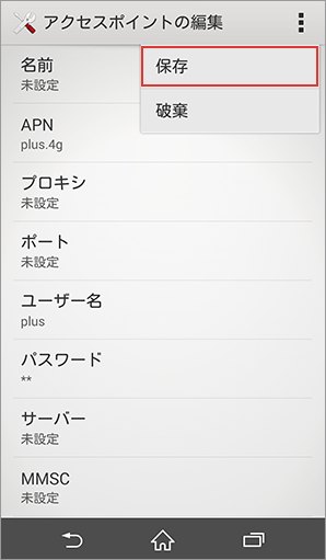 メニューから「保存」をタップし、APN一覧で設定したAPNを選択します。