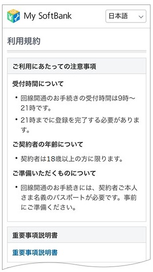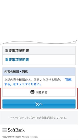 「ご利用にあたっての注意事項」と「重要事項説明書」の内容を確認の上「同意する」にチェックを入れて「次へ」をタップしてください。