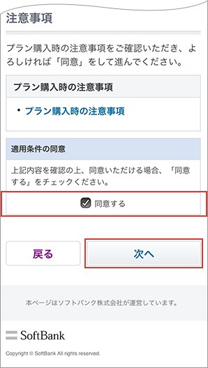「プラン購入時の注意事項」の内容を確認の上「同意する」にチェックを入れて「次へ」をタップしてください。