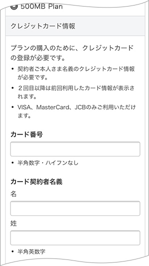 | 500MB / 31日プラン有効期間は、購入日を含め31日間となっております。 | 1,650円プランの表示価格は税込価格となります。 |