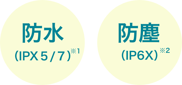 ※1 IPX5とは、内径6.3mmの注水ノズルを使用し、約3mの距離から12.5L/分の水を最低3分間注水する条件であらゆる方向から噴流を当てても機器の機能が動作することを意味します。IPX7とは、常温で水道水、かつ静水の水深1mのところに静かに沈め、約30分間放置後に取り出したときに電話機としての機能を有することを意味します(水中においてカメラ機能は使用できません)。 ※2 IP6Xとは、直径75μm以下の塵埃(じんあい)が入った装置に電話機を8時間入れてかくはんさせた後、本機の内部に塵埃が侵入しない機能を有することを意味します。