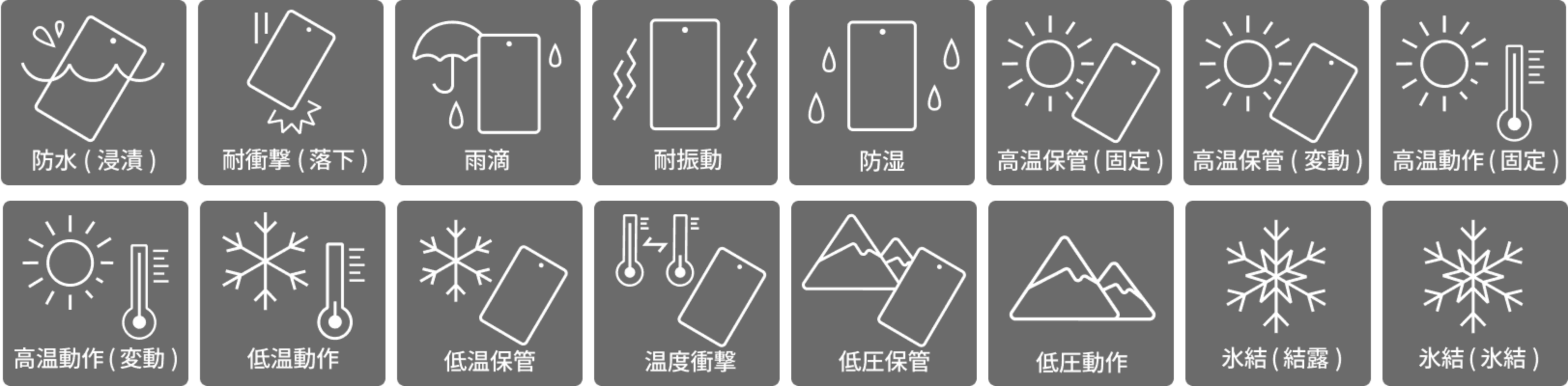 ※2 米国国防総省の調達基準(MIL-STD-810H)の15項目、防水(浸漬)、防水(雨滴)、耐振動、防湿、高温保管(固定)、高温保管(変動)、高温動作(固定)、高温動作(変動)、低温動作、低温保管、温度耐久(温度衝撃)、低圧保管、低圧動作、氷結(結露)、氷結(氷結)に準拠した試験を実施。および米国国防総省の調達基準(MIL-STD-810G)の1項目、耐衝撃(落下)に準拠した試験を実施。なお、すべての衝撃に対して、無破損、無故障を保証するものではありません。