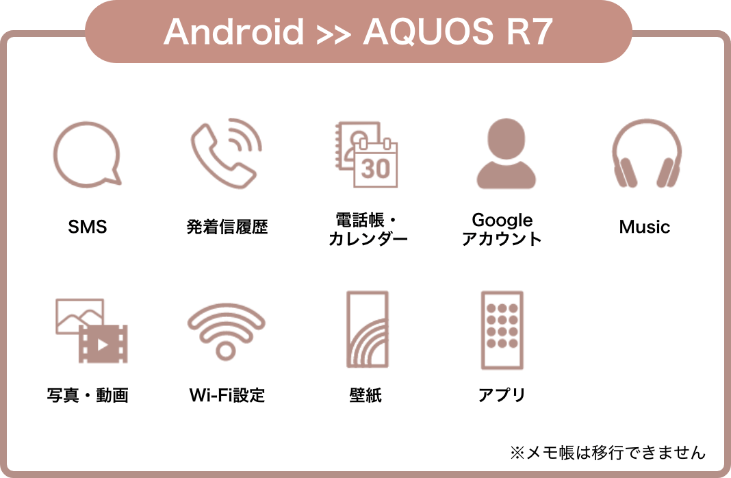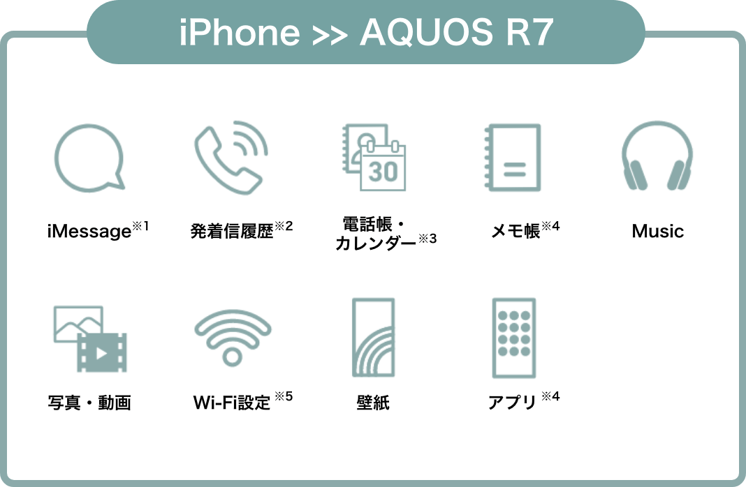※1 Googleの「メッセージ」などで表示可能です。※2 iOS13以上かつ、暗号化されている場合です。※3 カレンダーのコピーにはGoogleアカウントが必要です。※4 Googleアカウントが必要です。※5 Wi-Fi設定は保存されますが、パスワードは再度入力いただく必要がございます。