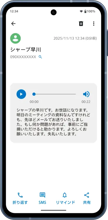 電車の中や会議中など、電話に出られない時も着信の内容を確認できる。