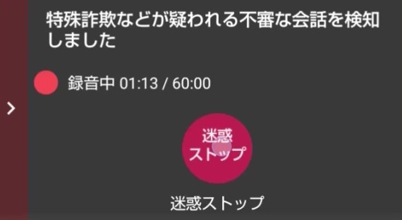 怪しいと感じたら、「迷惑ストップ」ボタンを押せば、自動音声で通話を終了。
